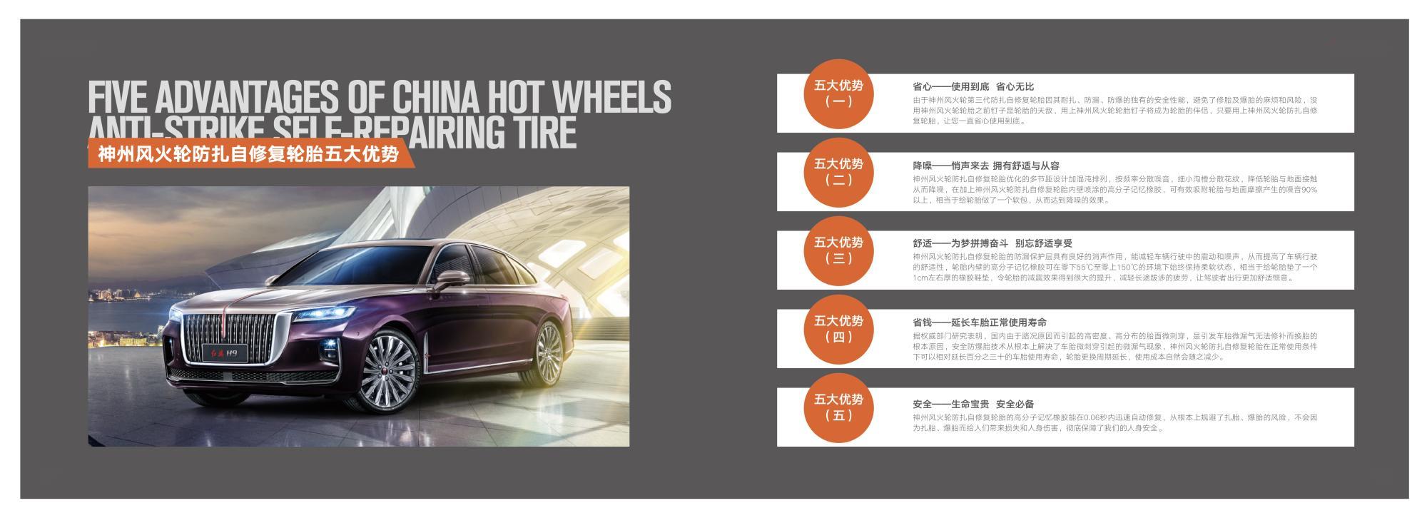 神州風(fēng)火輪智能防扎自修復(fù)輪胎介紹 隨著人們生活水平的不斷提高,汽車已經(jīng)進(jìn)入尋常百姓家庭成為各個(gè)家庭生活當(dāng)中必不可少的代步工具。在大家享受著汽車帶給我們出行便利的同時(shí),也往往因?yàn)槲覀儗?duì)一些部件的忽視導(dǎo)致一些煩惱和意外的發(fā)生。輪胎作為汽車使用過(guò)程中不可或缺的重要組成部分,不僅承載著汽車的全部重量,同時(shí)也是駕駛舒適性和行駛安全性的基礎(chǔ)保障。輪胎安全是汽車行駛過(guò)程中的重中之重,行業(yè)中流傳著這樣一句話高速爆胎≈生命報(bào)廢,所以說(shuō)高速爆胎是危害駕乘安全的最大殺手。但大多數(shù)人對(duì)于輪胎的認(rèn)知度卻知之甚少,從而使扎胎爆胎以及由此引發(fā)的意外不斷的在我們身邊上演。據(jù)權(quán)威部門統(tǒng)計(jì)顯示,我國(guó)每年在高速公路上發(fā)生的交通事故多達(dá)30多萬(wàn)起。在這30多萬(wàn)起的交通事故中,其中76%以上與輪胎高速爆胎有關(guān),也就是說(shuō)100起交通事故中就有76起和輪胎有關(guān)系,所以說(shuō)輪胎安全不容小覷,輪胎安全升級(jí)勢(shì)在必行。